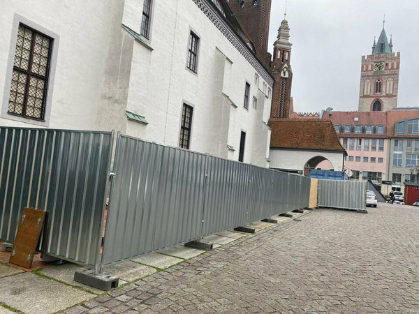 Die Blechplatten bieten 100 % Sichtschutz – ein klarer Vorteil gegenüber klassischen Bauzäunen mit Netzen oder Planen.